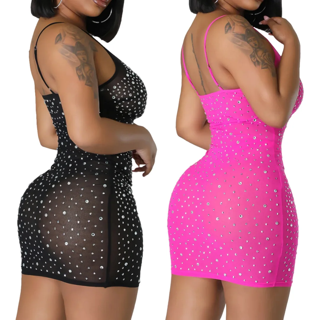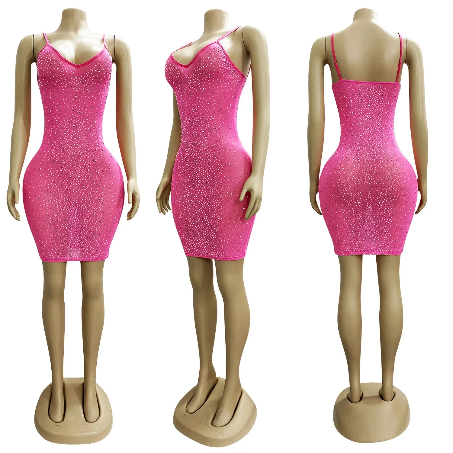 Summer New Product Women's Sexy Mesh Hot Diamond Nightclub Strap Short Dress Bag Hip Skirt V-neck